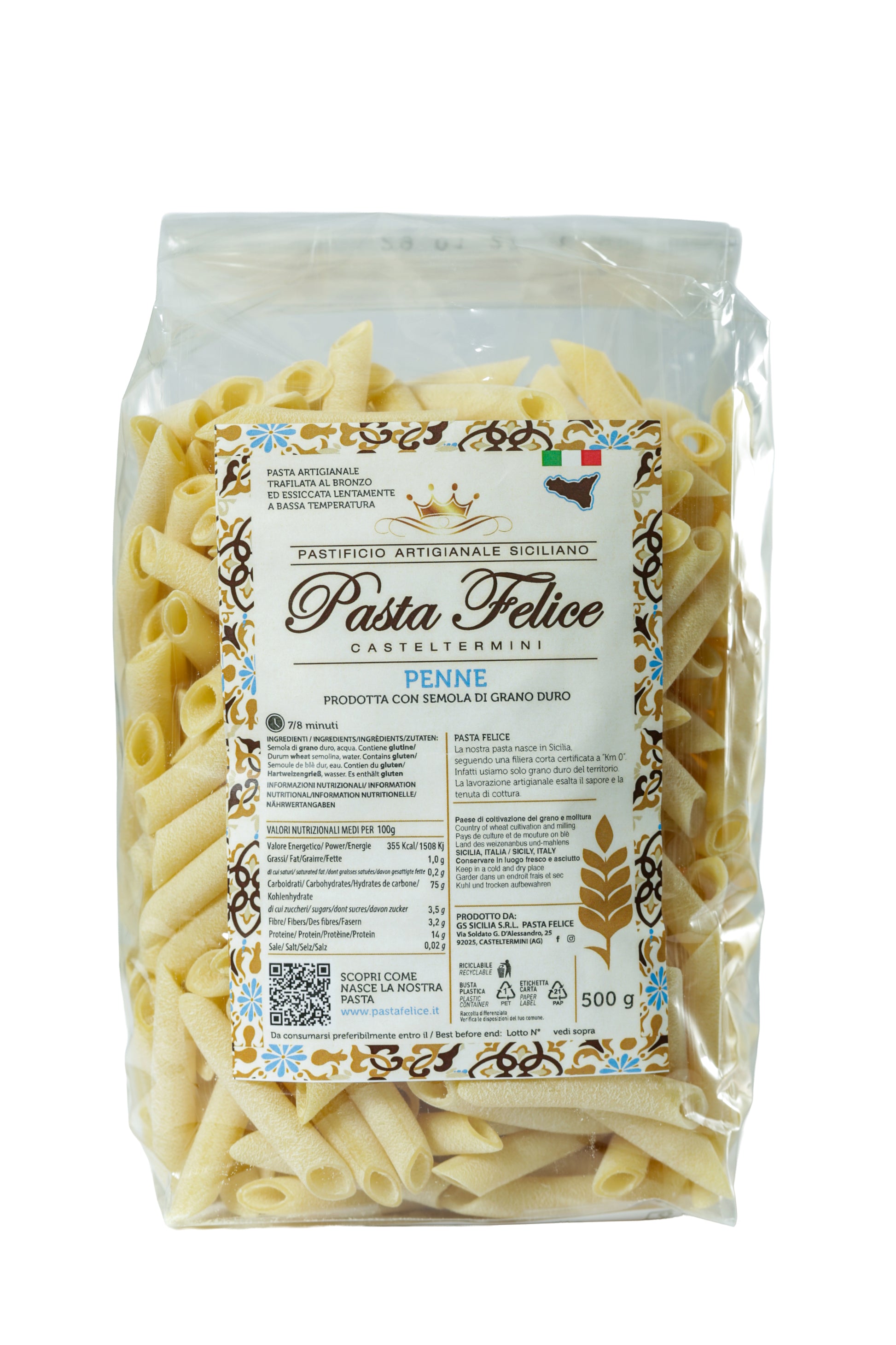 Hergestellt aus den besten sizilianischen Weizensorten – Simeto, Core und Duilio – überzeugt diese Pasta durch ihre ausgezeichnete Kochfestigkeit und ihr volles, authentisches Aroma. Perfekt für jeden Tag und für alle, die reine, ursprüngliche Qualität schätzen.