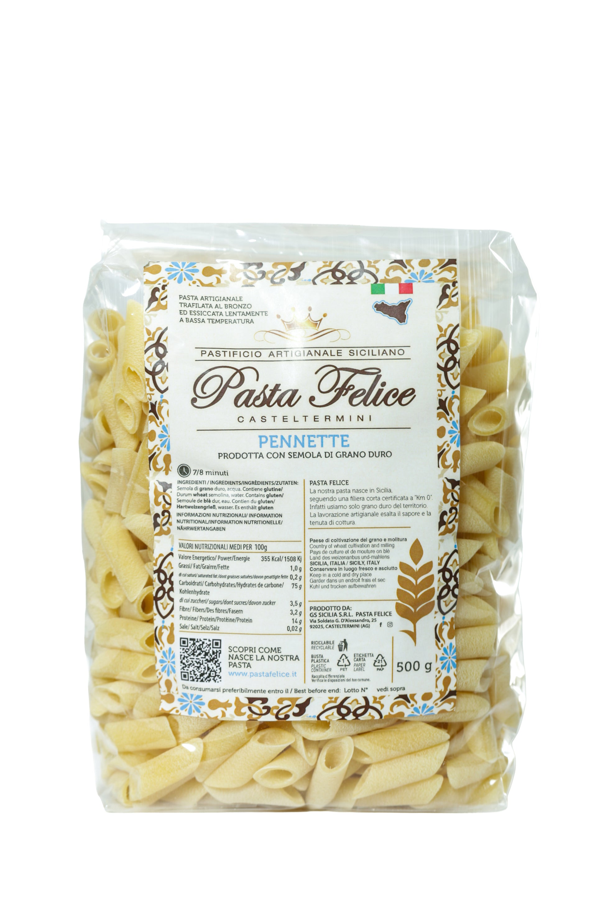 Hergestellt aus den besten sizilianischen Weizensorten – Simeto, Core und Duilio – überzeugt diese Pasta durch ihre ausgezeichnete Kochfestigkeit und ihr volles, authentisches Aroma. Perfekt für jeden Tag und für alle, die reine, ursprüngliche Qualität schätzen.